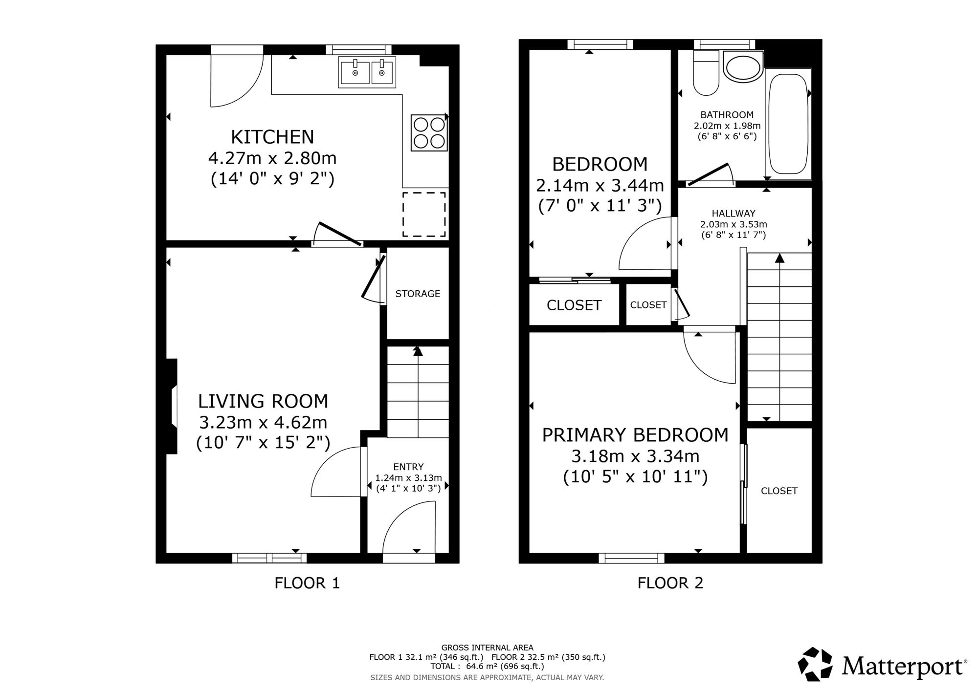Upstairs, the accommodation includes two good-sized double bedrooms, both with built in wardrobes and offering space for additional bedroom furniture. The bathroom is fitted with a modern white suite, including a bath with shower over, and completes the first-floor layout.